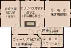 2階展示室の配置 1、ヴォーリズ記念室 2、唐笠何蝶記念室 3、ピアソンの故郷エリザベス市(姉妹都市)展示室 エリザベス市ホームページアドレス https://www.elizabethnj.org 4、ゆかりの人々展示室&応接室(来客用寝室)