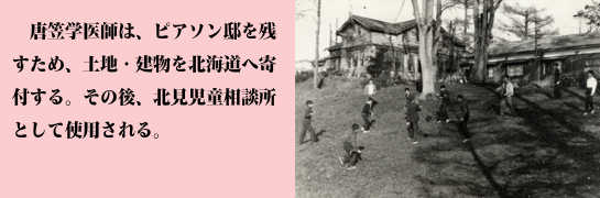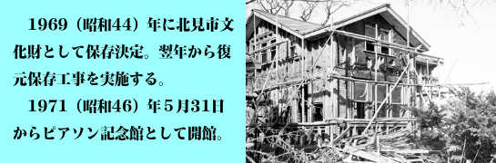 1939(昭和14)年、北見教会長老唐笠学医師が住宅として使用するようになる。1952(昭和27)年から1963(昭和38)年まで、北海道立北見児童相談所として使用する。その後YMCAが一時期使用するが、1969(昭和44)年、北見市教育委員会が文化財として復元保存を決定し、1971(昭和46)年5月31日にピアソン記念館として開館する。
