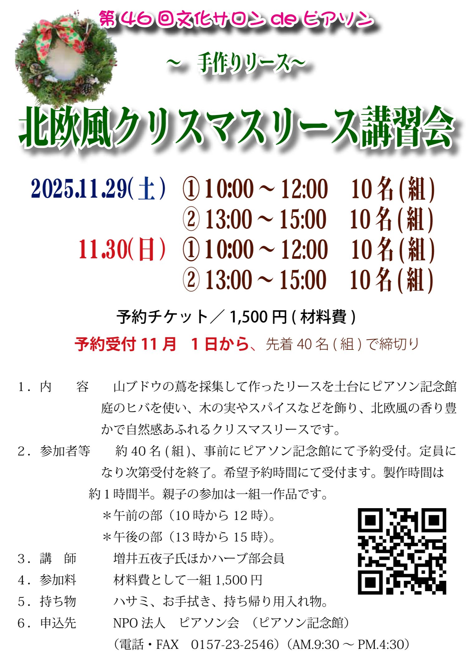 クリスマスリース講習会いよいよクリスマスの準備です!詳しくは行事案内